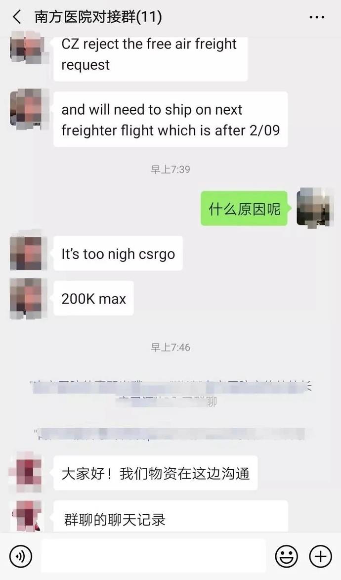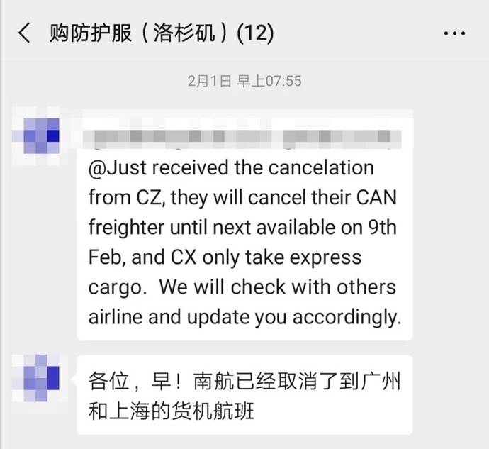 南航突然拒绝了我们通过客运腹舱免费带货的请求,需要等2月9日的货运航班装运。