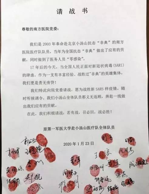 *南方医院首批奔赴武汉疫区医疗队的“请战书”